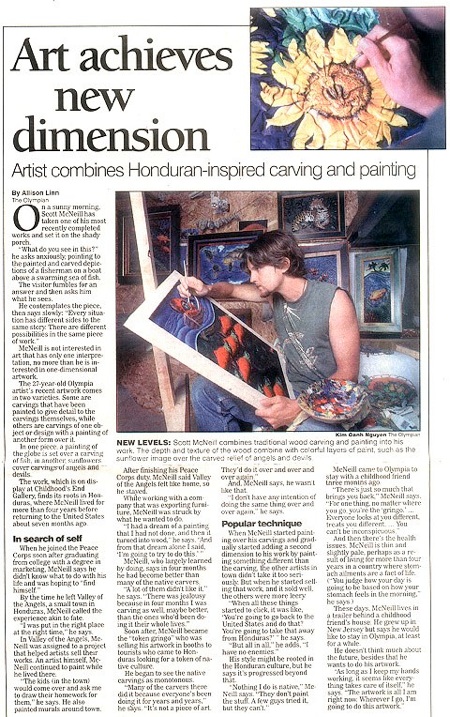 McNeill, who largely learned by doing, says that in four months had become better than many of the native carvers. …Soon after McNeill began selling his artwork in booths to tourists who came to Honduras looking for a token of native culture. He began to see the native carvings as monotonous. …"I don’t have any intention of doing the same thing over and over again," he says.