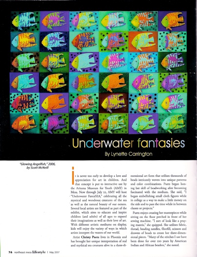 Referring to his recent works, McNeill said, "I was always searching for ideas for my wood carvings." He experimented with special powders mixed with clear casting resin and applied those powders in his castings to come up with art pieces that glow. McNeill explained,"(The powder) was originally designed by the Japanese for wristwatches." Five to 20 minutes of light exposure will allow his stunning pieces to glow up to 14 hours. McNeill participates in various shows, displays at art centers and other galleries. His "Angelfish" piece is a vibrant array of reef-inspired color displayed on a series angelfish carvings that is part of the A.M.Y. exhibition. To learn more about Scott McNeill, visit www.ScottMcNeillArt.com